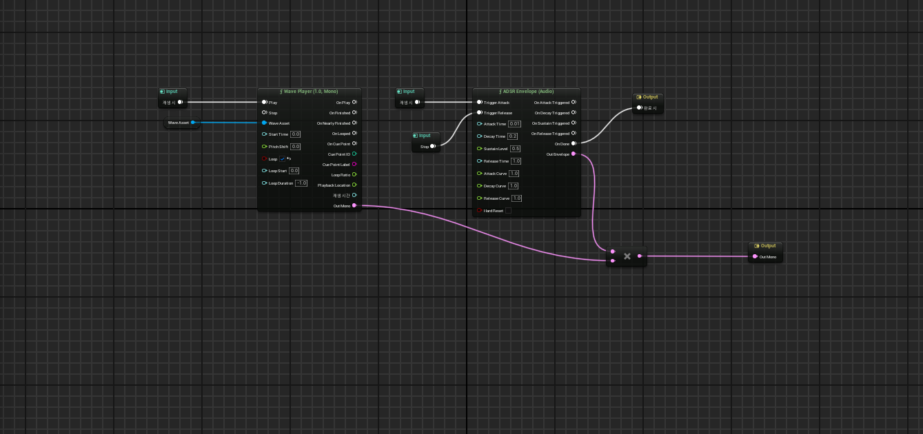 다음으로 재생 시 Input 트리거와 Stop 트리거를 각각 ADSR Envelope의 Trigger Attack, Trigger Release 핀에 연결합니다.